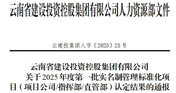 近日,集團通報了2025年度第一批建筑工人實(shí)名制管理標準化項目(項目公司/指揮部/直管部)認定結果,公司承建的5個(gè)項目成功通過(guò)集團實(shí)名制管理標準化項目認定,分別是第一直管部保山某項目、第二直管部云南農業(yè)大學(xué)學(xué)生食堂(稷香園)建設項目、第七直管部五華區數字經(jīng)濟產(chǎn)業(yè)園西北新城園區項目、第八直管部文山職業(yè)技術(shù)學(xué)院產(chǎn)教融合實(shí)訓基地項目。