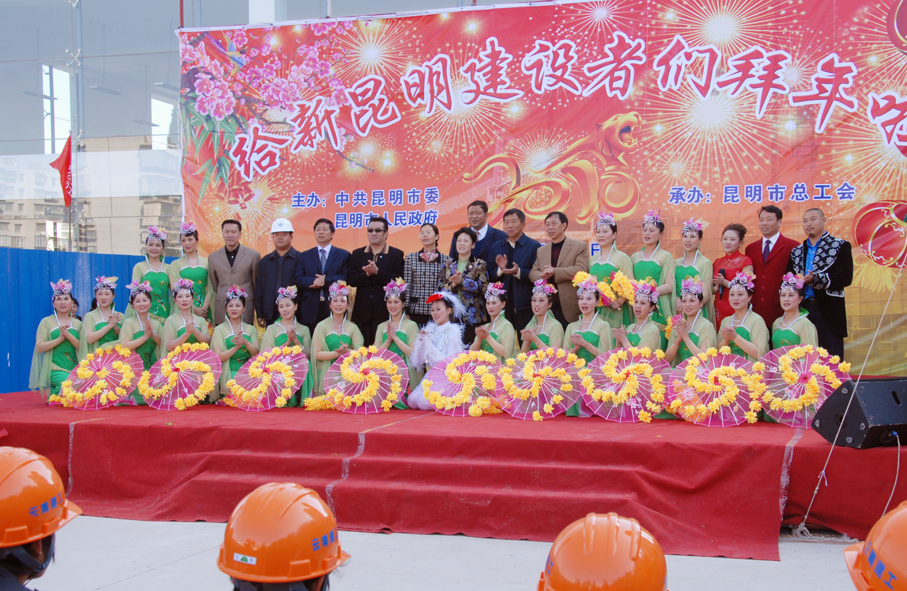 2月4日上午,受昆明市委、市政府委托,昆明市總工會(huì )主席楊麗等領(lǐng)導同志率團到云南建工第五建設有限公司昆明工人文化宮建設工地,給包括農民工在內的新昆明建設者拜年,給建設者送來(lái)新春的祝福和溫暖的禮品。楊麗主席和工會(huì )干部以及昆明市楓葉職工藝術(shù)團的演員們分別獻上精彩的歌舞。
