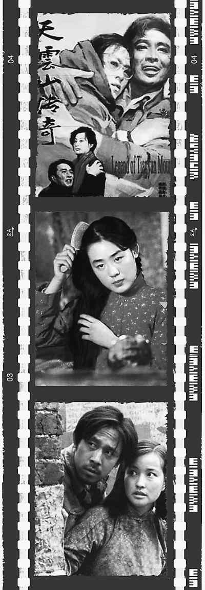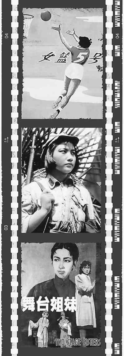 圖從上到下依次為《女籃五號》、《紅色娘子軍》、《舞臺姐妹》的電影劇照或電影海報。 |