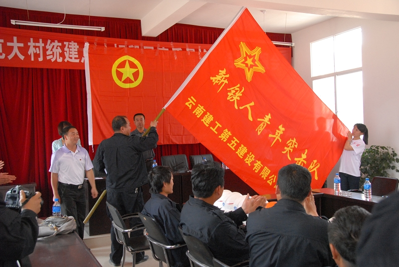 圖為集團公司團委副書(shū)記雷棲為項目部青年突擊隊授旗